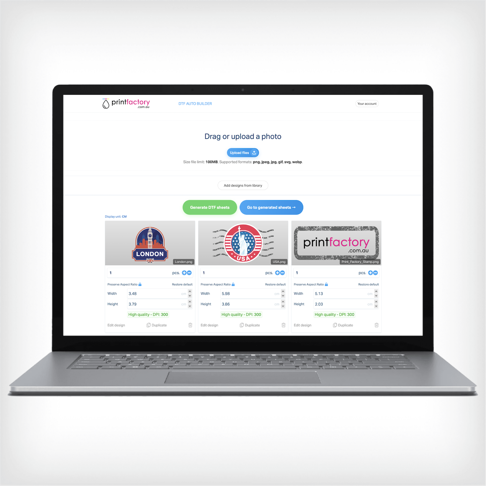 - Please make sure to only upload high-resolution 300dpi .png files with transparent background to the Gangsheet Builder to ensure print quality. *WARNING: images with resolution other than 300dpi may be resized automatically.